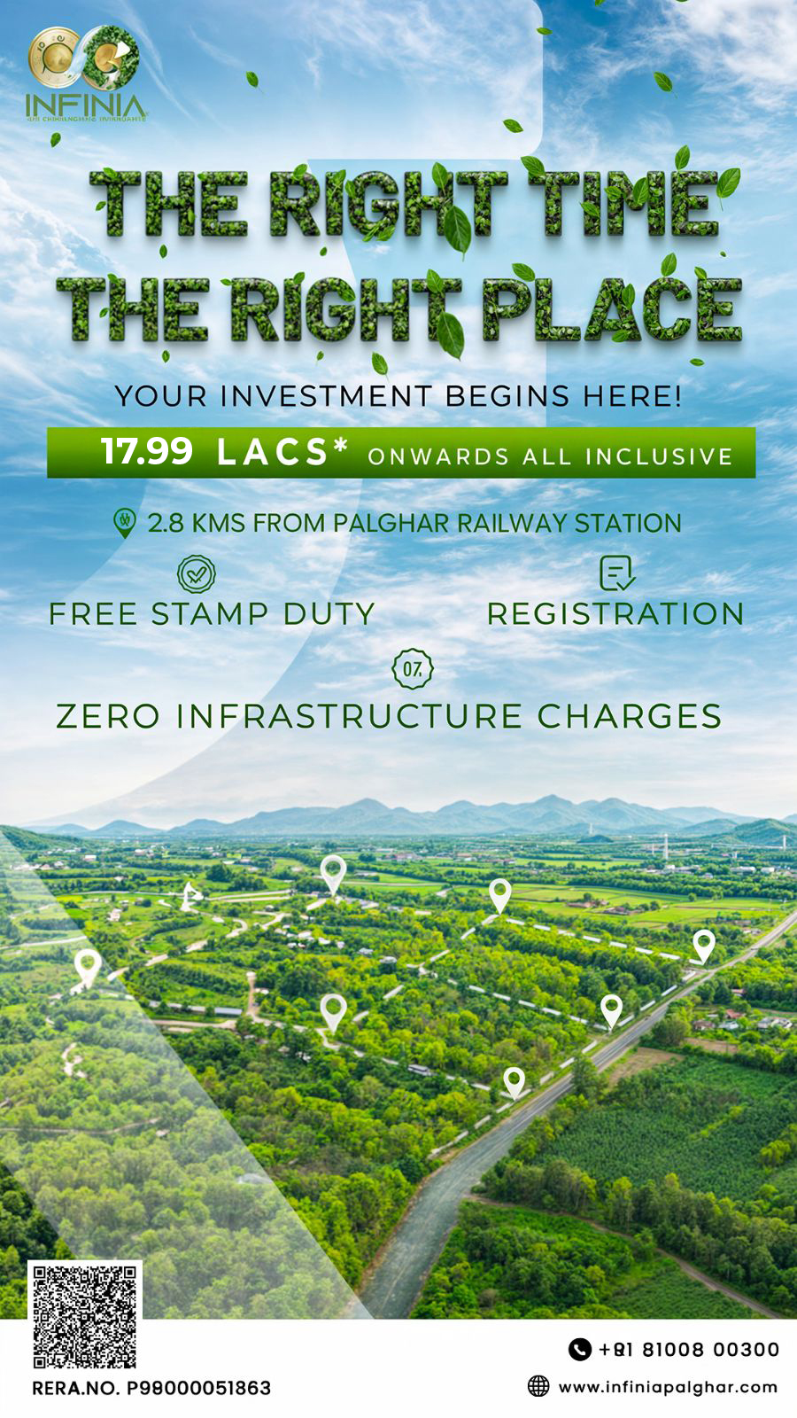 Own a part of PALGHAR’S MOST AWAITED DEVELOPMENT. Infinia offers you NA plots with stunning hill views in a cluster destined to be the region’s biggest growth story. The project is located in the heart of a green expanse yet JUST 5 MINUTES FROM PALGHAR RAILWAY STATION. It has the ideal setting for ECO-FRIENDLY URBAN LIFE. Also, each plot comes with individual ownership (i.e. seperate 7/12 & Survey map) and is located 2 hours from Mumbai, becoming the perfect investment destination.